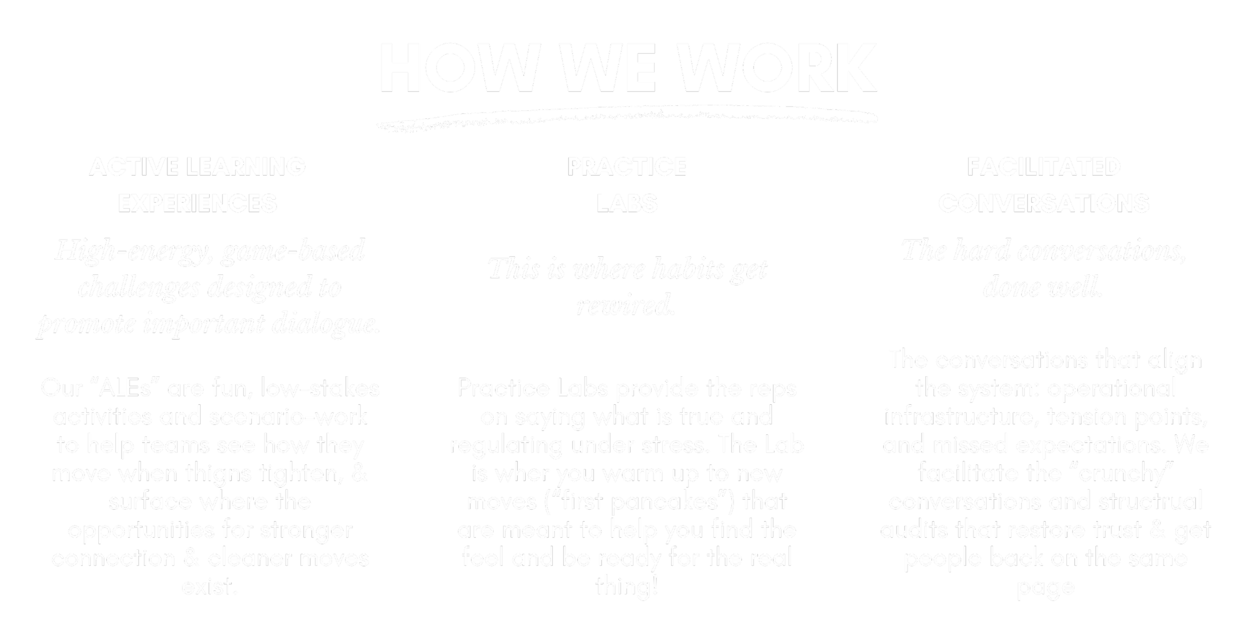 Through active learning experiences, facilitated conversations, and individual coaching, they help executives strengthen relationship performance and practice Clean Communication under pressure so leaders can align, make better decisions, and lead with clarity.